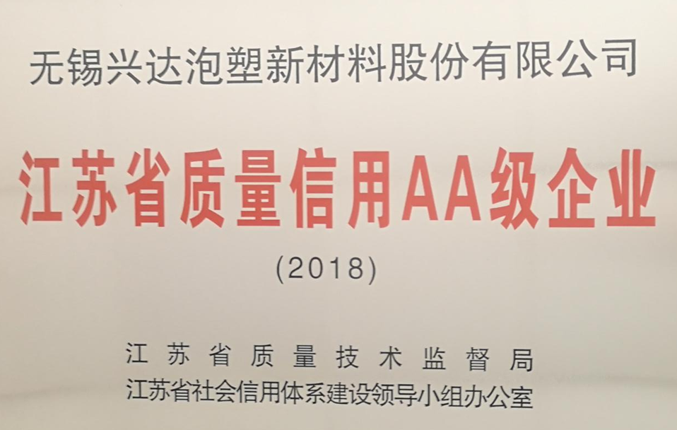 無錫興達(dá)泡塑新材料股份有限公司通過2018年度江蘇省質(zhì)量信用AA級企業(yè)認(rèn)證!